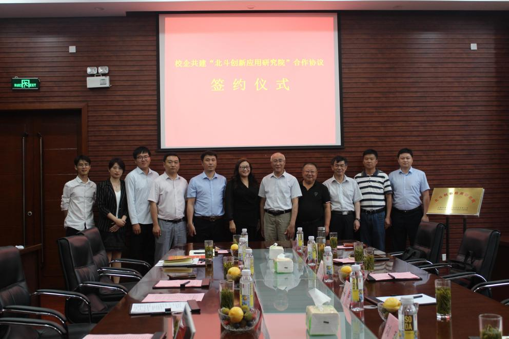 余学祥和盛鸣红代表院企双方签署《共建“北斗创新应用研究院”合作协议》,郑明东和盛鸣红为“北斗创新应用研究院”揭牌。