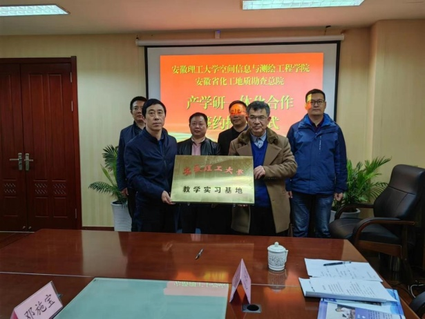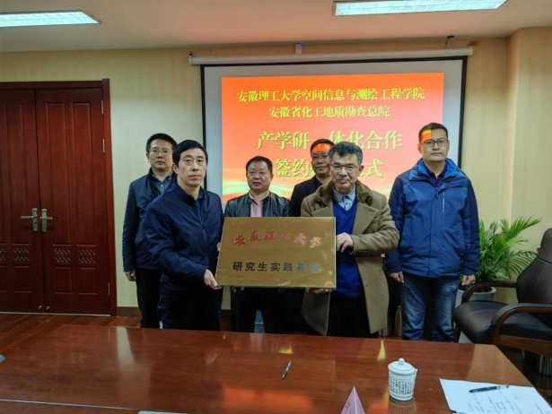 院长余学祥教授、副院长赵兴旺教授、副院长王磊教授和导航工程系主任方新建一行4人赴安徽省化工地质勘查总院举行了共建研究生实践基地与本科生教学实习基地合作协议签约授牌仪式。安徽省化工地质勘查总院党委书记、院长杨成荣,纪委书记、副院长张博,党委委员、自然资源调查监测分院院长言龙,党委委员、安徽化工地质工程勘察院有限公司常务副总经理邓施宝,党委委员、党政办主任杨玉军,人事科副科长刘晓丽,自然资源调查监测分院副院长关烨等参加了签约仪式。签约仪式由杨成荣主持。
