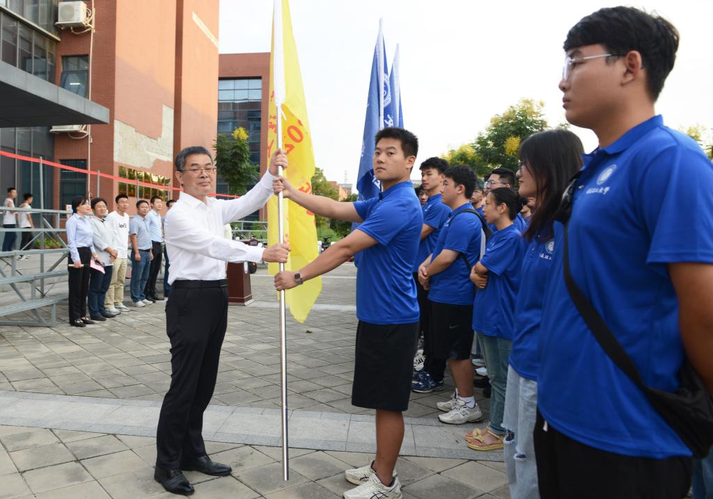 学院院长余学祥为2023级新生班级授班旗,各班负责人接旗。