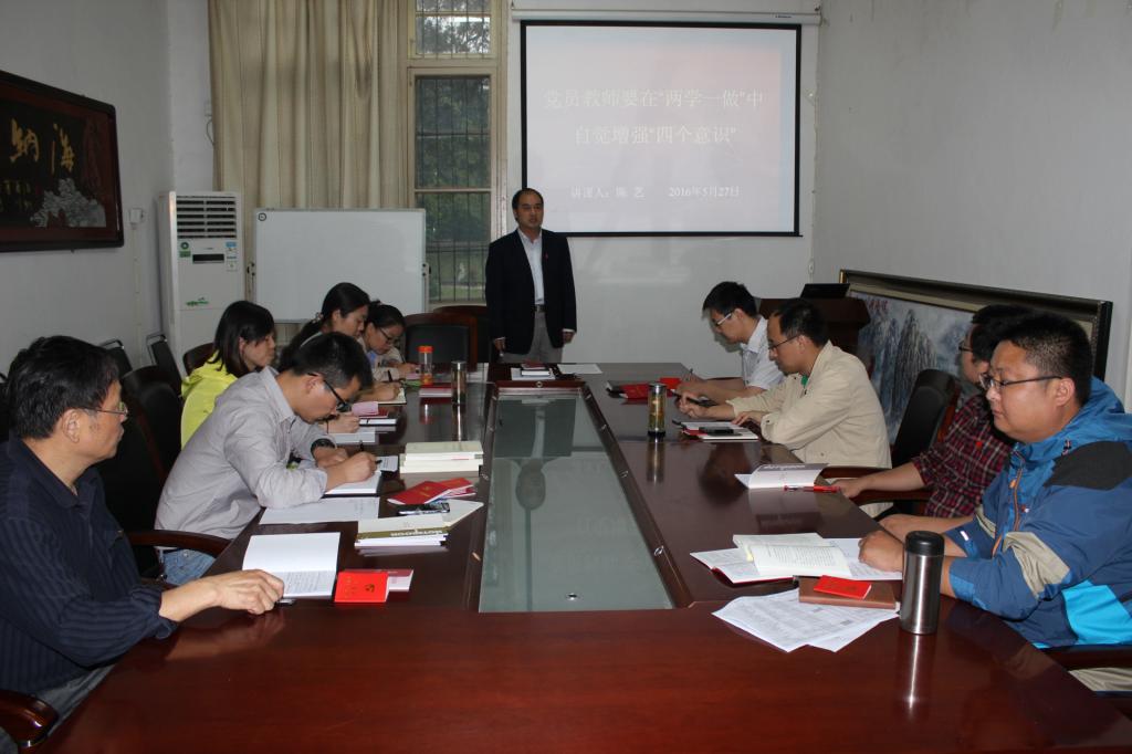 陈艺系统解释了“四个意识”的内涵,讲清楚党员教师为什么要增强“四个意识”,如何增强“四个意识”。要求党员教师,一要切实增强政治意识,始终做到政治方向不偏、政治信仰不变、政治立场不移。二要切实增强大局意识,始终做到正确认识大局、自觉服从大局、坚决维护大局。三要切实增强核心意识,始终做到坚决拥护核心、坚决服从核心、坚决维护核心。四要切实增强看齐意识,始终做到主动看齐、坚决看齐、经常看齐,自觉在思想上政治上行动上与党中央保持高度一致。